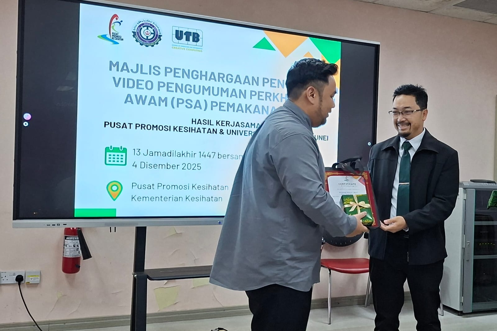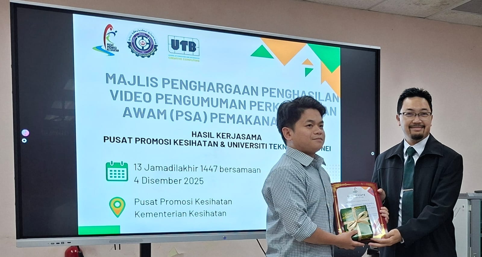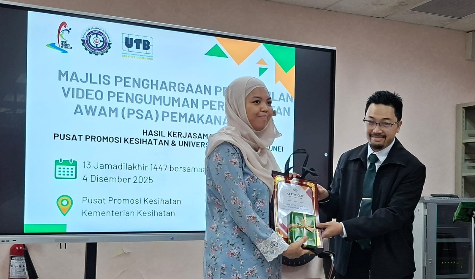 The Health Promotion Centre (HPC), Ministry of Health, recently held an appreciation ceremony recognising UTB students for producing Healthy Eating Public Service Announcement (PSA) videos as part of a collaborative initiative between the Ministry of Health and Universiti Teknologi Brunei (UTB).