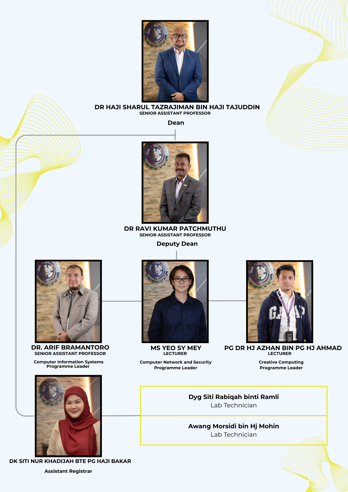 School of Computing and Informatics (SCI) originated from the Department of Computing and Information Systems that was established in 1986 when Universiti Teknologi Brunei (UTB) was still in its infancy. It was made one of the departments under the School of Business and Management in 2003. When UTB was upgraded to a university in 2008, it became a program area under the Faculty of Business and Computing. Recognising the rapid growth in the fields of dedicated computing systems and creative informatics, SCI was formed in 2014 and consists of three programme areas: